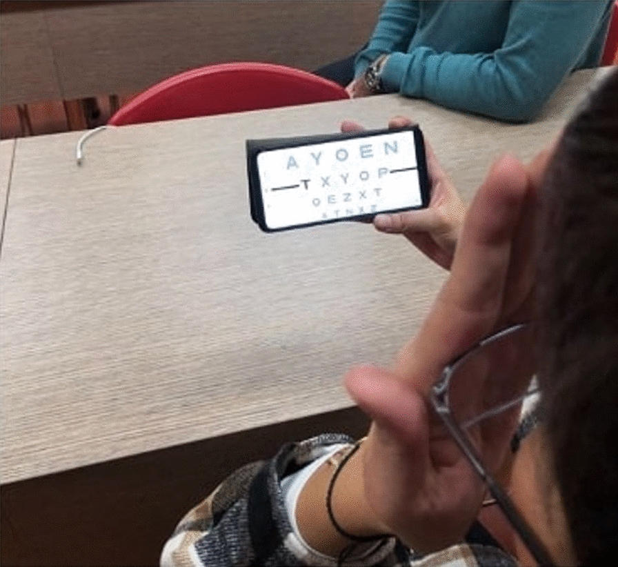 Participant testing near visual acuity with the K-VA application with the supervision of a trained healthcare provider