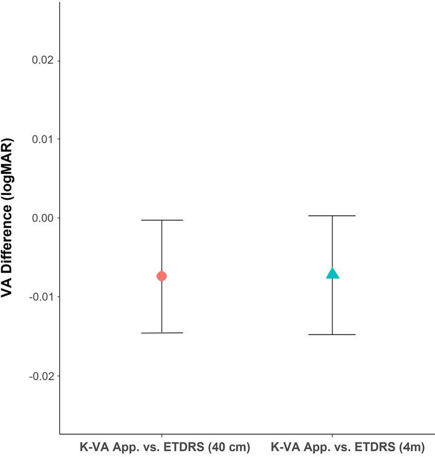 In a recent systematic review evaluating the performance of other previously validated VA applications to reference standards, the mean differences ranged from −0.08 to 0.10 logMAR while the distribution of the differences, as expressed by the 95% LoA, ranged from ± 0.08 logMAR (lowest variability) to ± 0.47 logMAR (highest variability) from the mean difference [16]. Furthermore, test–retest variability of logMAR charts ranged from ± 0.07 to ± 0.18 logMAR from the mean difference [16]. Similarly, the K-VA test performed within these ranges, compared with the standard ETDRS charts.