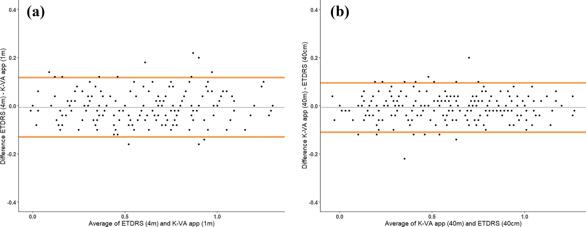Bland–Altman plots of VA measurements by the standard ETDRS charts and K-VA application at 1 m (diagram A) and 40 cm (diagram B) distance. The grey line represents the mean difference and the orange line represents the upper and lower 95% limits of agreement