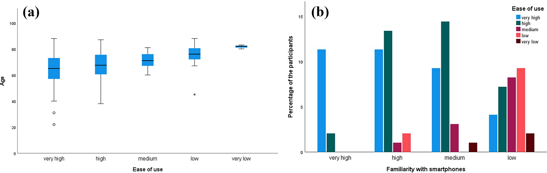 Overall, 97 participants, all Android users, answered the questionnaire; 52 were female (53.6%) with a mean age of 67.42 ± 12.97 years. In total, 71 (73.2%) stated that the test was easy to very easy to use, and 40 (41.3%) stated having high to very high familiarity with new technologies (smartphones, tablet computers, etc.). There was a significant association between ease of use and familiarity with smartphones (p < 0.001). Age was found to significantly correlate with ease of use (p = 0.007). These correlations are illustrated in Fig. 5.