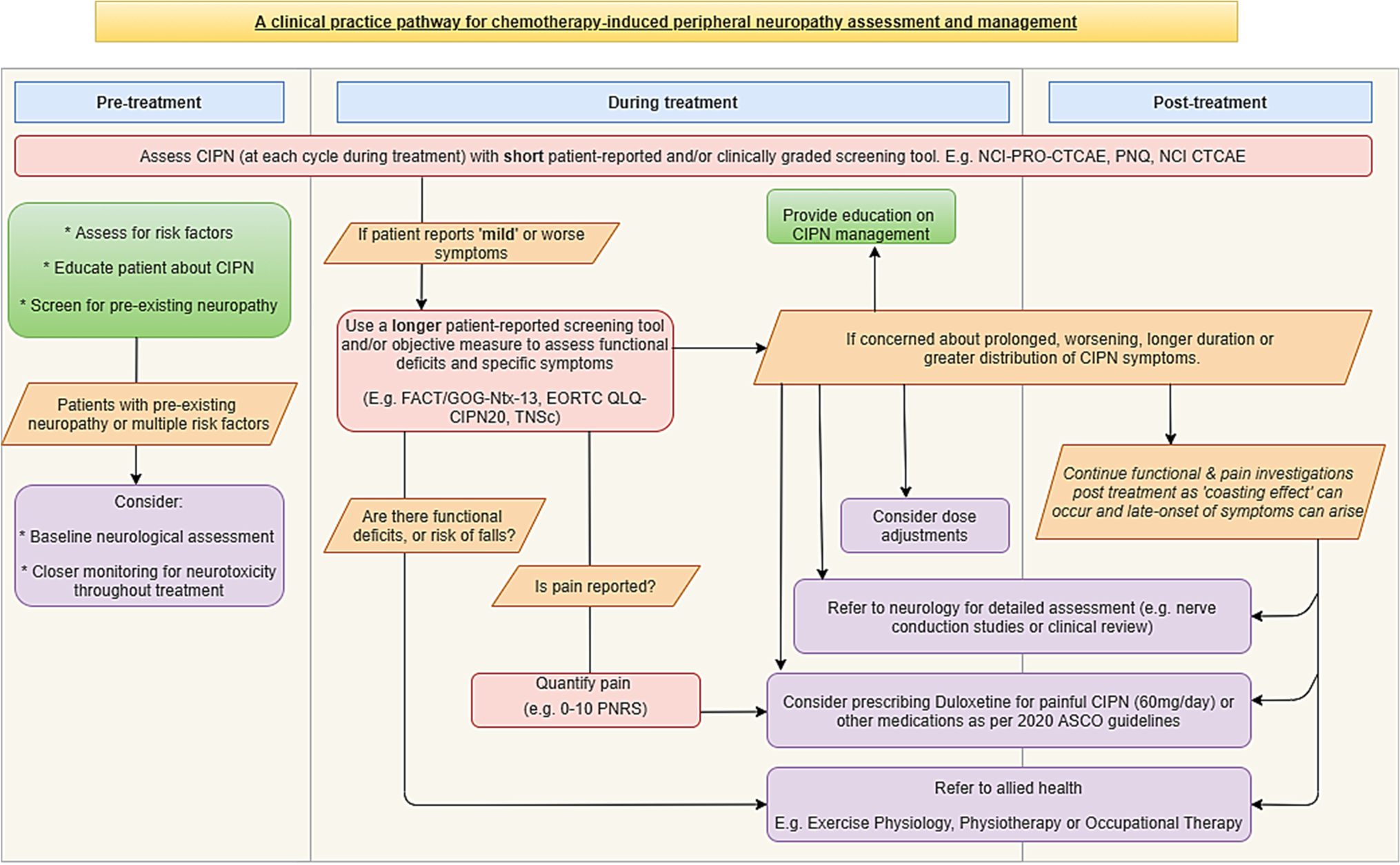 16]. There are limited pathways outlining best practices for the assessment and management of CIPN across healthcare teams, with current guidelines synthesising evidence for preventative and treatment interventions [