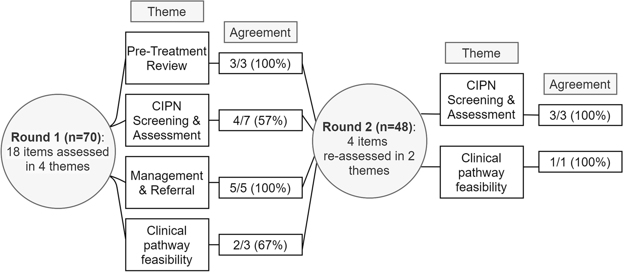 The consensus was reached on 2/3 items (67%) in stage 1 (73–86% agreement). Participants agreed that implementing the CIPN-path would improve CIPN outcomes for patients and that the proposed pathway should be adapted to each site depending on the needs of the population and the availability of resources. One item did not reach consensus in stage 1, which was that CIPN-path represented a realistic and achievable process. This item did reach consensus in stage 2 (Table