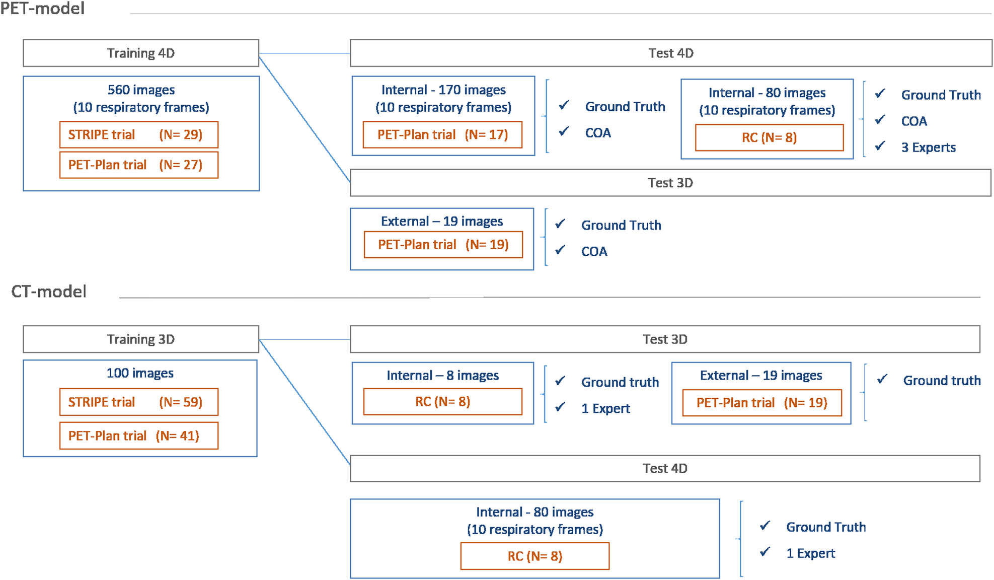 Ground truth was defined by the consensus of two radiation oncologists. One additional expert contoured the 3D- and 4D-CT sets for the eight patients for the internal validation of CT. Three additional experts contoured each of the time-bins for the eight patients for the retrospective cohort employed in the internal evaluation of 4D-PET algorithm. Besides technical instructions for the use of the delineation software, the readers received no further assistance and were blinded to all other delineations.