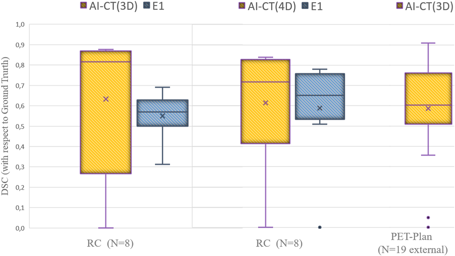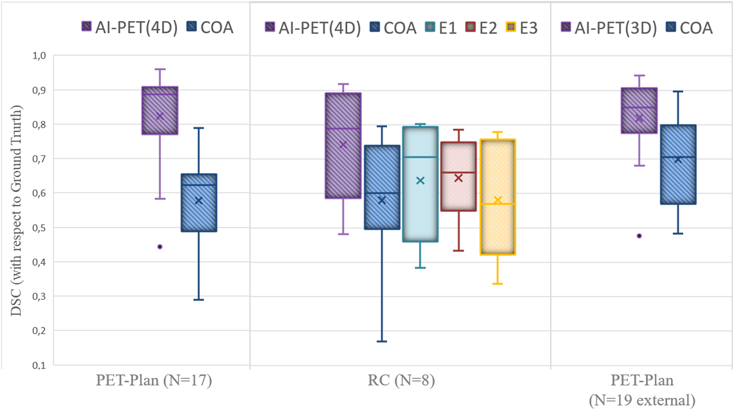 DSC for the different PET segmentations approaches (artificial- intelligence-algorithm AI, contrast-oriented-algorithm COA and experts E) with respect to the ground truth defined by consensus of two radiation oncologists. Performance for the segmentation model on PET images with (4D) and without (3D) respiratory motion compensation are presented. The average value is represented by the cross and the median by the line