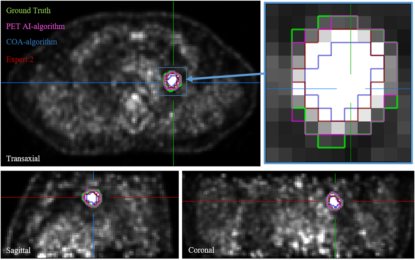 Different PET segmentations approaches (ground truth, artificial intelligence-algorithm AI, contrast-oriented-algorithm COA and expert with the best DSC with respect to the ground truth) for a patient employed in the validation of the performance of the algorithm on PET images with respiratory motion compensation