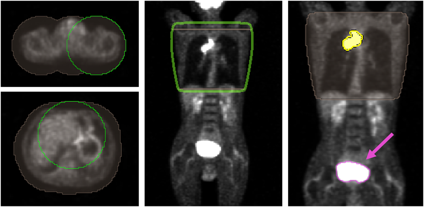 Workflow for the lung mask creation: left regions of interest (brown) are manually delineated surrounding the body by a 50 voxel circle (green) in two slices located up and down the lung region; middle automatic interpolation is performed between the slices and lung region mask resulted (green) and (right) boolean intersection (yellow) between the AI segmentation and the lung region mask is obtained and consequently, the bladder region is rejected (segmentation pointed by the pink arrow)