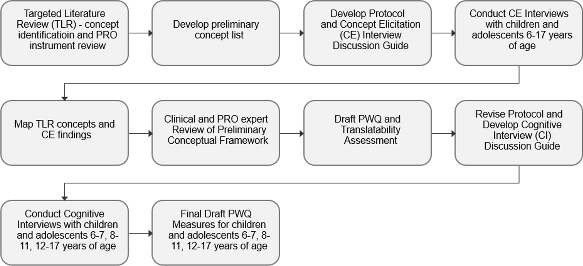 This study included four steps: (1) targeted literature review (TLR); (2) concept elicitation (CE) interviews; (3) conceptual framework and development of the draft PWQ; and (4) cognitive interviews (CI). An overview of the project flow is presented in Fig. 1. The CE interviews and CI were noninterventional, cross-sectional, qualitative studies involving semi-structured interviews with children and adolescents 6–17 years of age and are detailed further below.