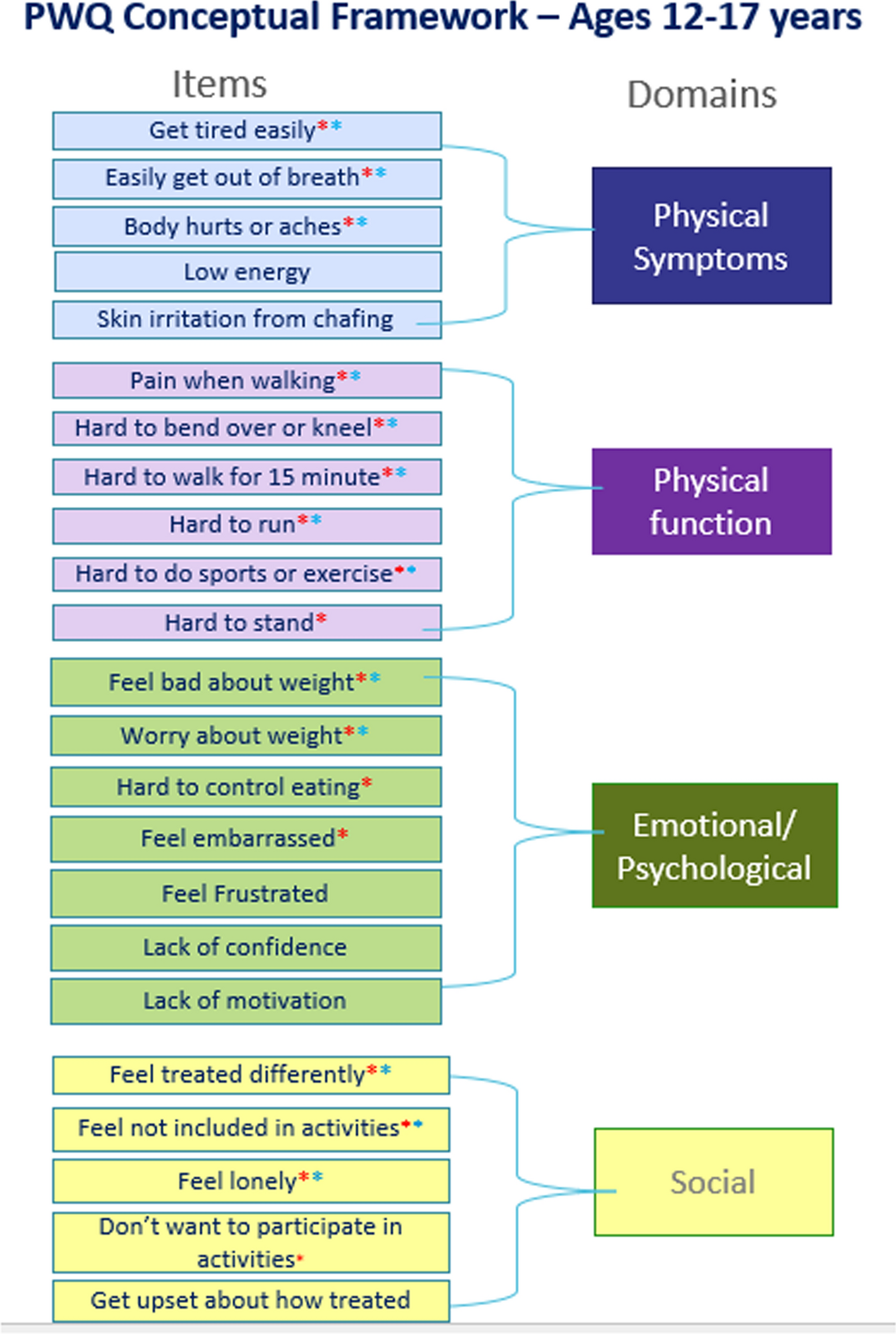 Conceptual framework for weight-specific patient-reported outcome for ages 12 to 17. *Blue = 6–7-year-old. *Red = 8–11-year-olds. Concepts shared across age groups. This instrument is available for free public use once copyright permission is obtained. To obtain a copy, contact copyright@lilly.com. PWQ Pediatric Weight Questionnaire