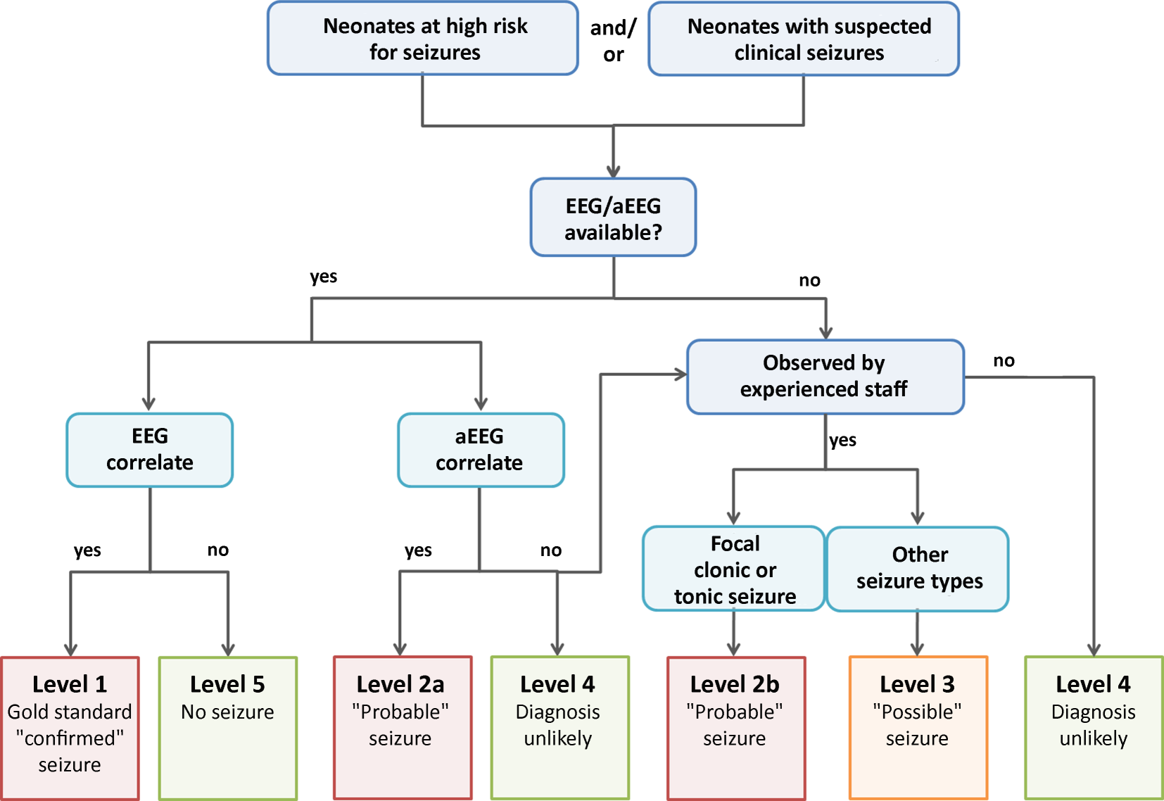 The classification is useful in neonates at high risk for seizures or who have exhibited abnormal clinical events suggestive of seizures. The presence of neonatal seizures is then confirmed by means of an EEG (either routine EEG or cEEG monitoring) or, if not available, an aEEG. If neither EEG nor aEEG is available, the recommendations for diagnostic certainty in neonatal seizures should be followed (Fig. 1).