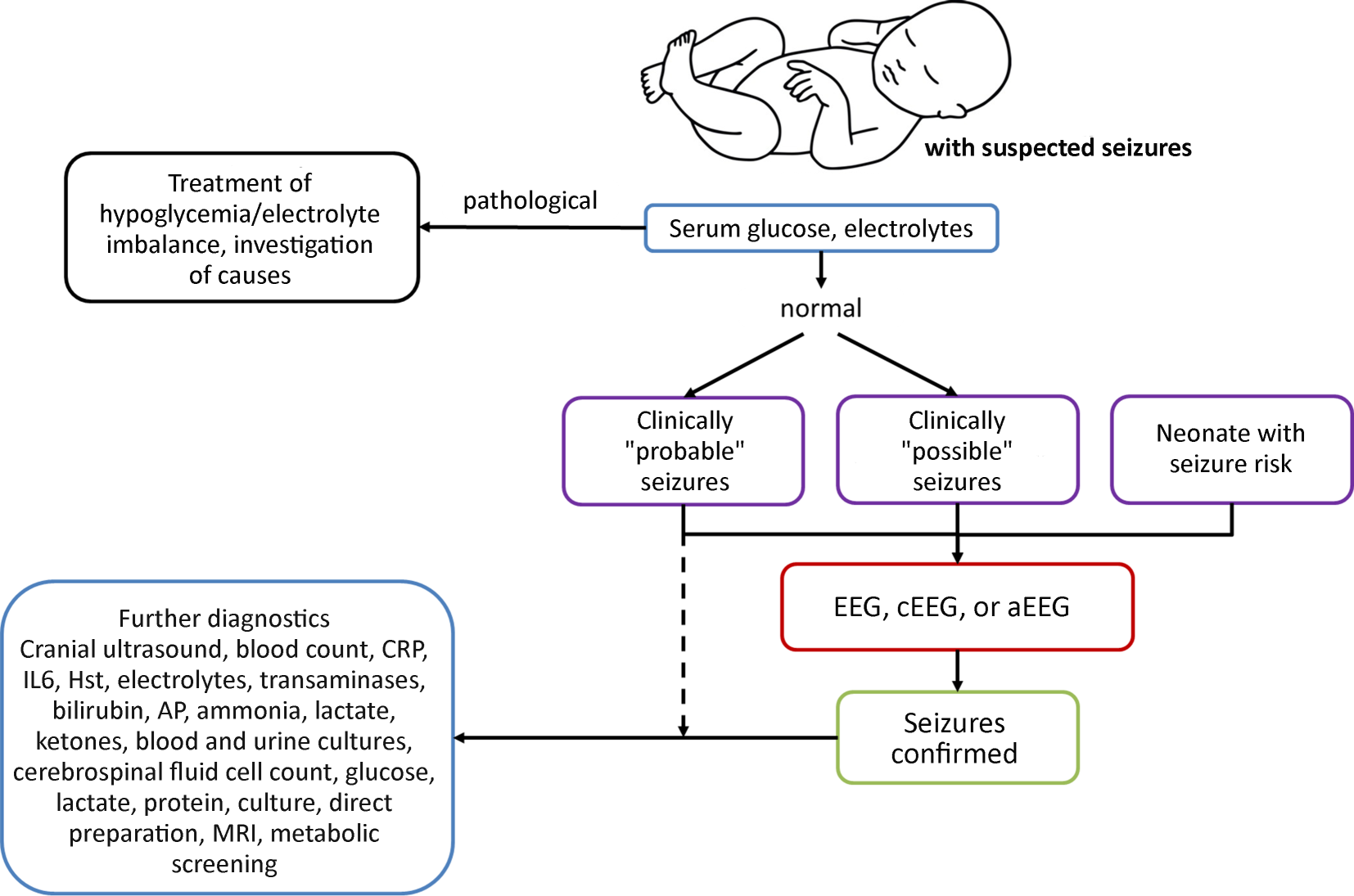 In addition to EEG and aEEG for establishing the diagnosis, imaging and laboratory investigations are required for etiological evaluation to enable targeted, coordinated treatment (Fig. 3). Hypoglycemia and electrolyte imbalance should always be ruled out; today, this can usually be achieved immediately using point-of-care methods. A complete blood count and analysis of inflammatory markers such as interleukin (IL)-6 and C‑reactive protein (CRP) should also be performed immediately. If there are clinical indications of infection, a lumbar puncture is necessary, possibly after imaging and provided the infant’s condition is sufficiently stable. Cranial ultrasound, if possible magnetic resonance imaging (MRI), is performed primarily to exclude hemorrhage.