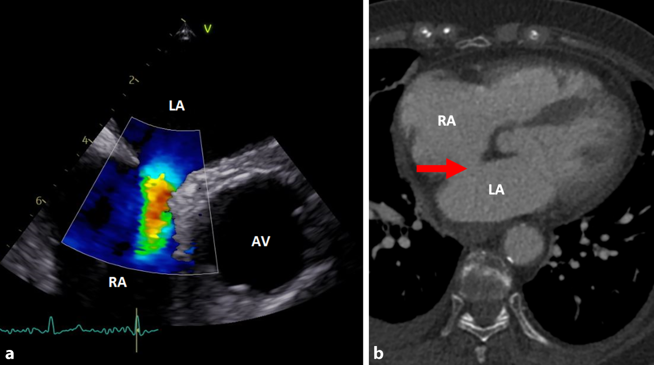 a Darstellung des ASD in der TEE. Der aus dem Defekt des Septums interatriale resultierende Shunt zwischen linkem (LA) und rechtem Vorhof (RA) ist sehr gut erkennbar. Rechts im Bild befindet sich die Aortenklappe (AV). b Auch in der CT lässt sich der ASD (Pfeil) darstellen