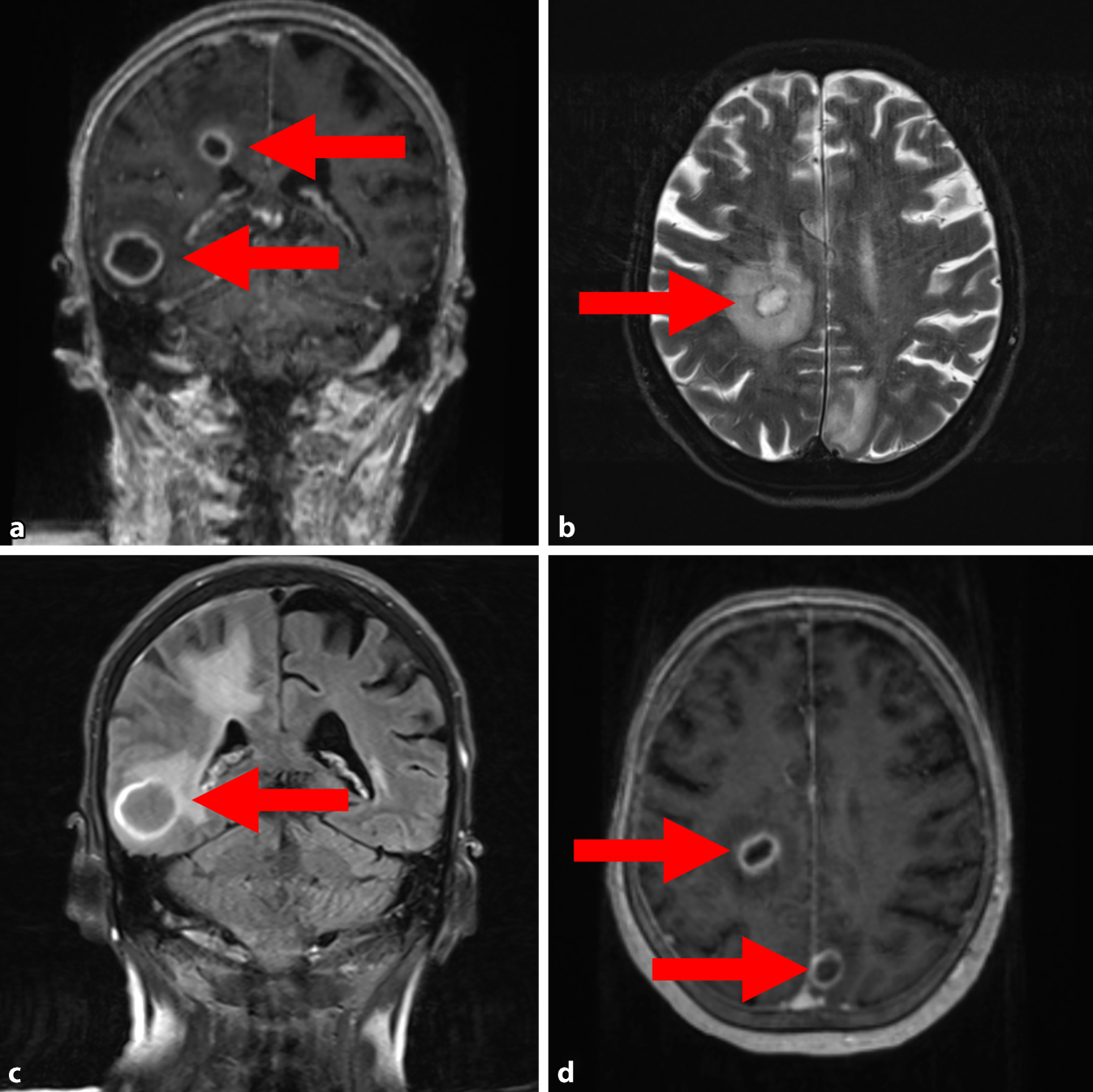 Multiple intrakranielle Abszesse (Pfeile) in der cMRT, die durch paradox-septische Embolien entstanden sind, jeweils markiert durch Pfeile. a Post-KM MP-RAGE koronar. b T2 TSE FS axial. c FLAIR koronar. d Post-KM MP-RAGE axial