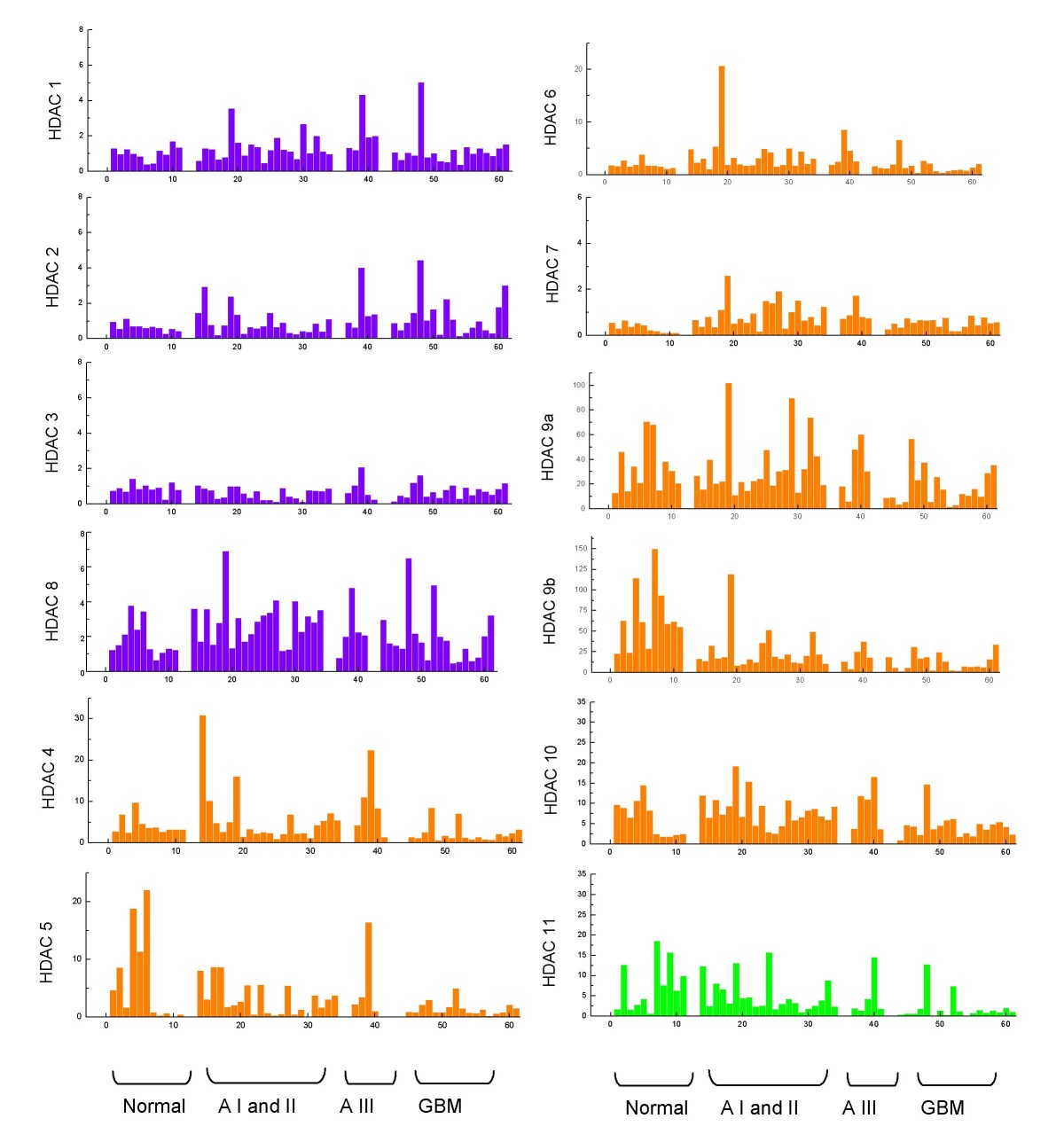 Global expression of HDACgenes in gliomas and normal brain tissue