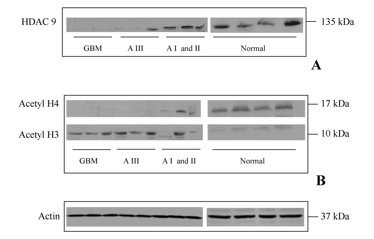 We found that mRNA levels of class II and IV HDACs were downregulated in glioblastomas compared to low-grade astrocytomas and normal brain tissue (7 in 8 genes, p < 0.05). The protein levels of class II HDAC9 were also lower in high-grade astrocytomas than in low-grade astrocytomas and normal brain tissue. Additionally, we found that histone H3 (but not histone H4) was more acetylated in glioblastomas than normal brain tissue.
