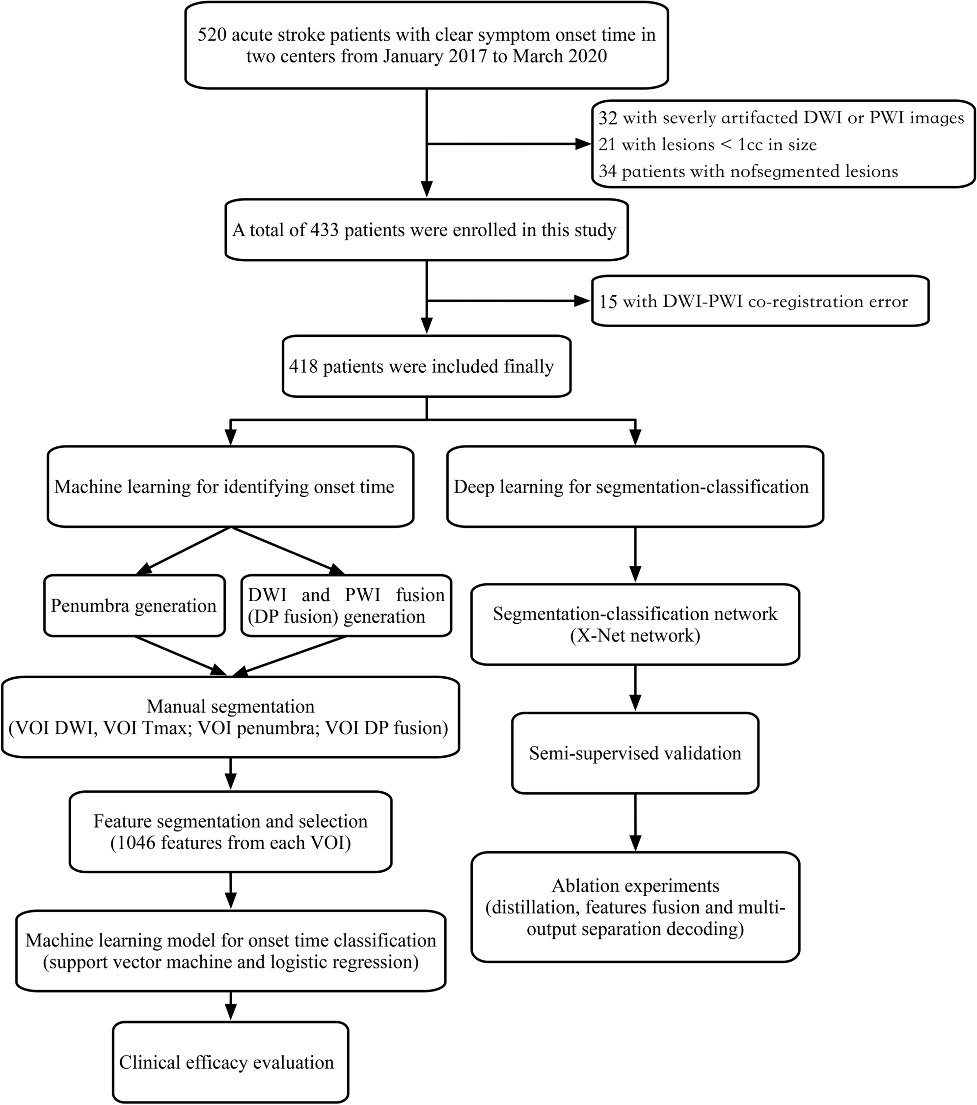 In conclusion, we developed an automatic machine learning model for identifying stroke within 4.5 h using images from two modalities (DWI and PWI). The DWI/PWI-based DP fusion model demonstrated the best performance in identifying the onset time among the evaluated models. To reduce the radiologist’s workload, we also proposed a segmentation-classification network (X-Net) and verified that it can achieve a performance close to that of the manual labeling method. We anticipate that this method could provide clinicians with decision-making guidance for acute stroke patients with unknown onset times.
