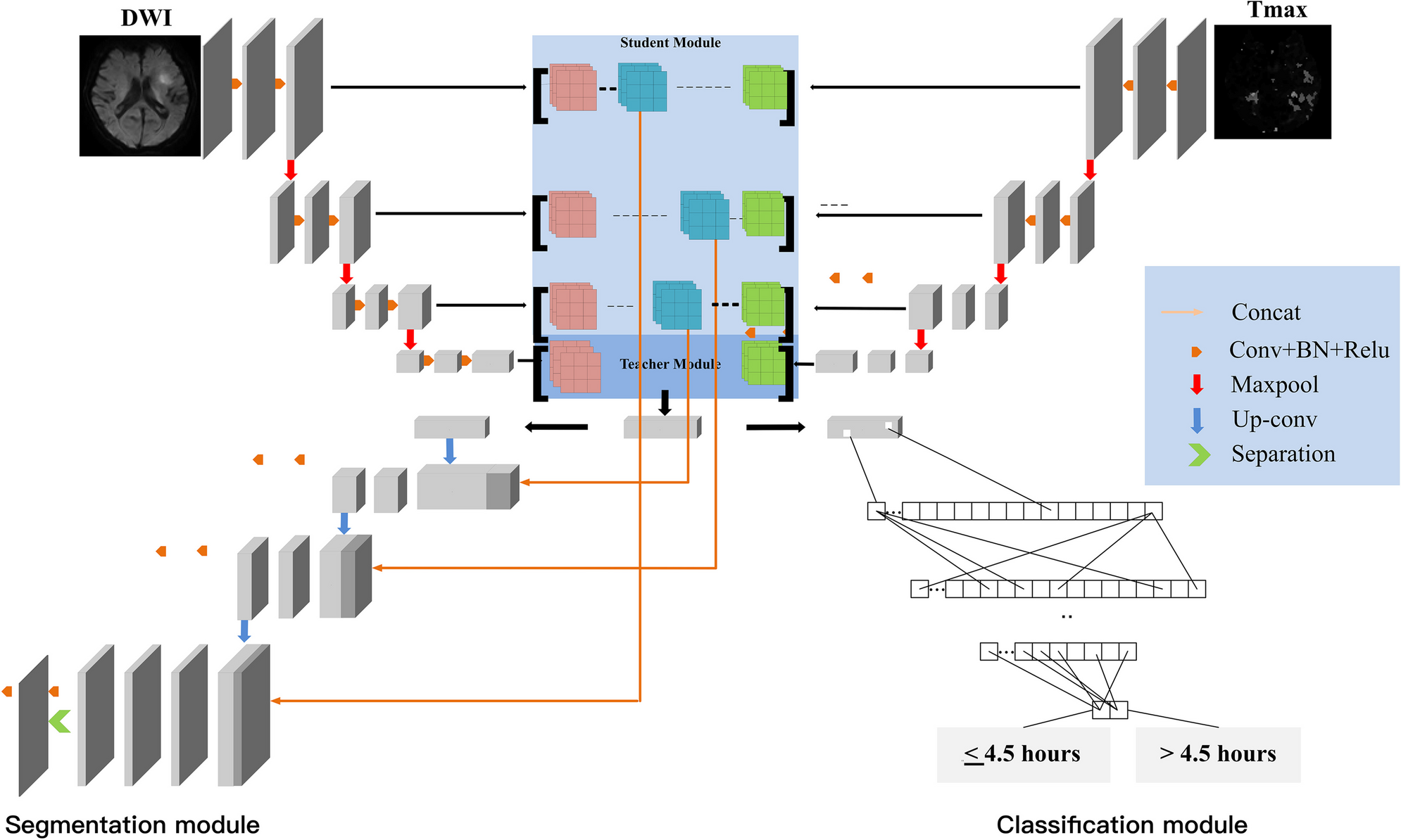 Segmentation and classification modules for identifying the onset time were designed in the same network frame, which we called X-Net, according to the shape of the model. The overall network architecture is shown in Fig. 2. The model consists of three components: a double distillation fusion encoder (differential distillation module and feature fusion module (Figure S1)), a multioutput separation decoding module (Figure S2), and a fully connected classifier. A detailed description of the model is provided in the Supplemental Materials (online). Additionally, conventional networks, including 2D Unet, 3D Unet, Vnet, and Attention Unet, were also used to segment DWI and Tmax images and compare them with X-Net. A few minutes are typically required to segment and classify a single patient with these methods. The classification and segmentation framework proposed in this study is shown in Fig. 3.