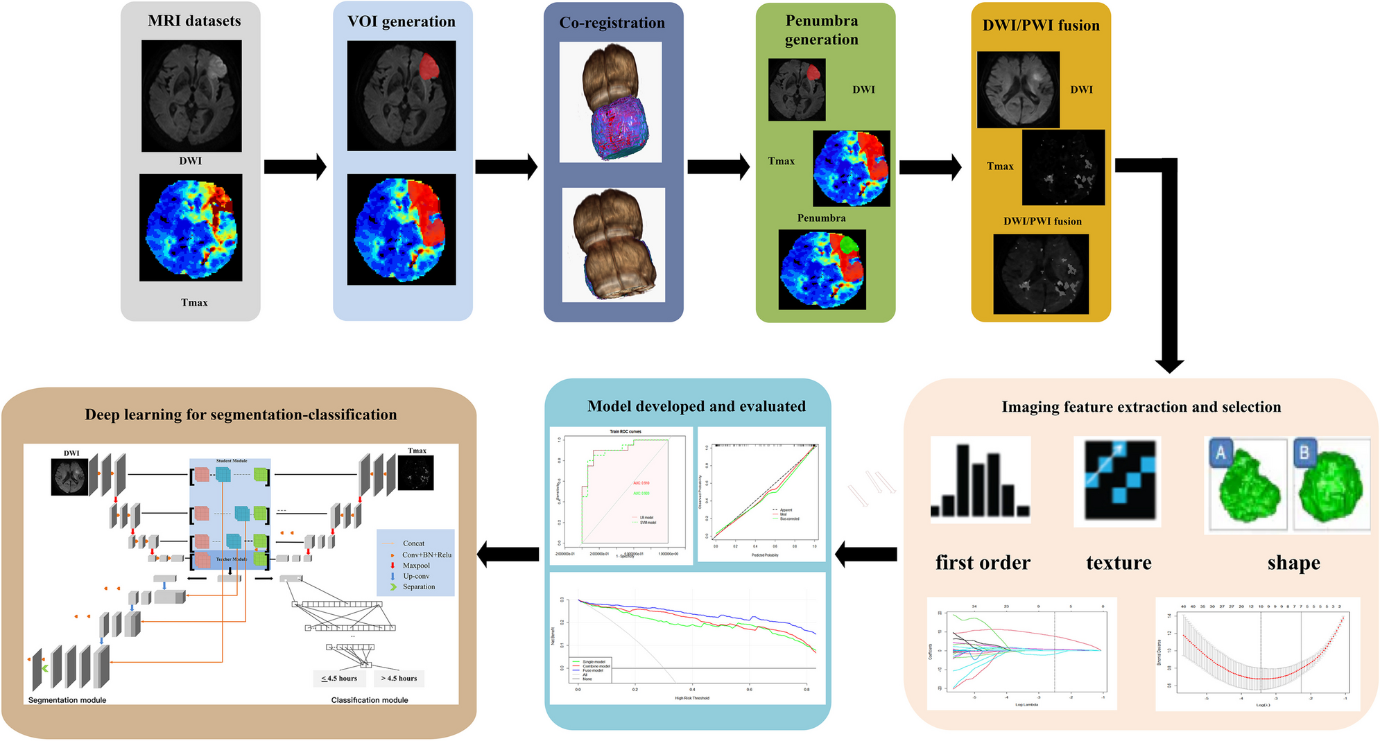 A total of 418 patients (≤ 4.5 h: 214; > 4.5 h: 204) were evaluated. The DP fusion model achieved the highest AUC in identifying the onset time in the training (LR: 0.95; SVM: 0.92) and test sets (LR: 0.91; SVM: 0.90). The DP fusion-LR model displayed consistent positive and greater net benefits than other models across a broad range of risk thresholds. The calibration curve demonstrated the good calibration of the DP fusion-LR model (average absolute error: 0.049). The X-Net model obtained the highest Dice coefficients (DWI: 0.81; Tmax: 0.83) and achieved similar performance to manual labeling (AUC: 0.84).