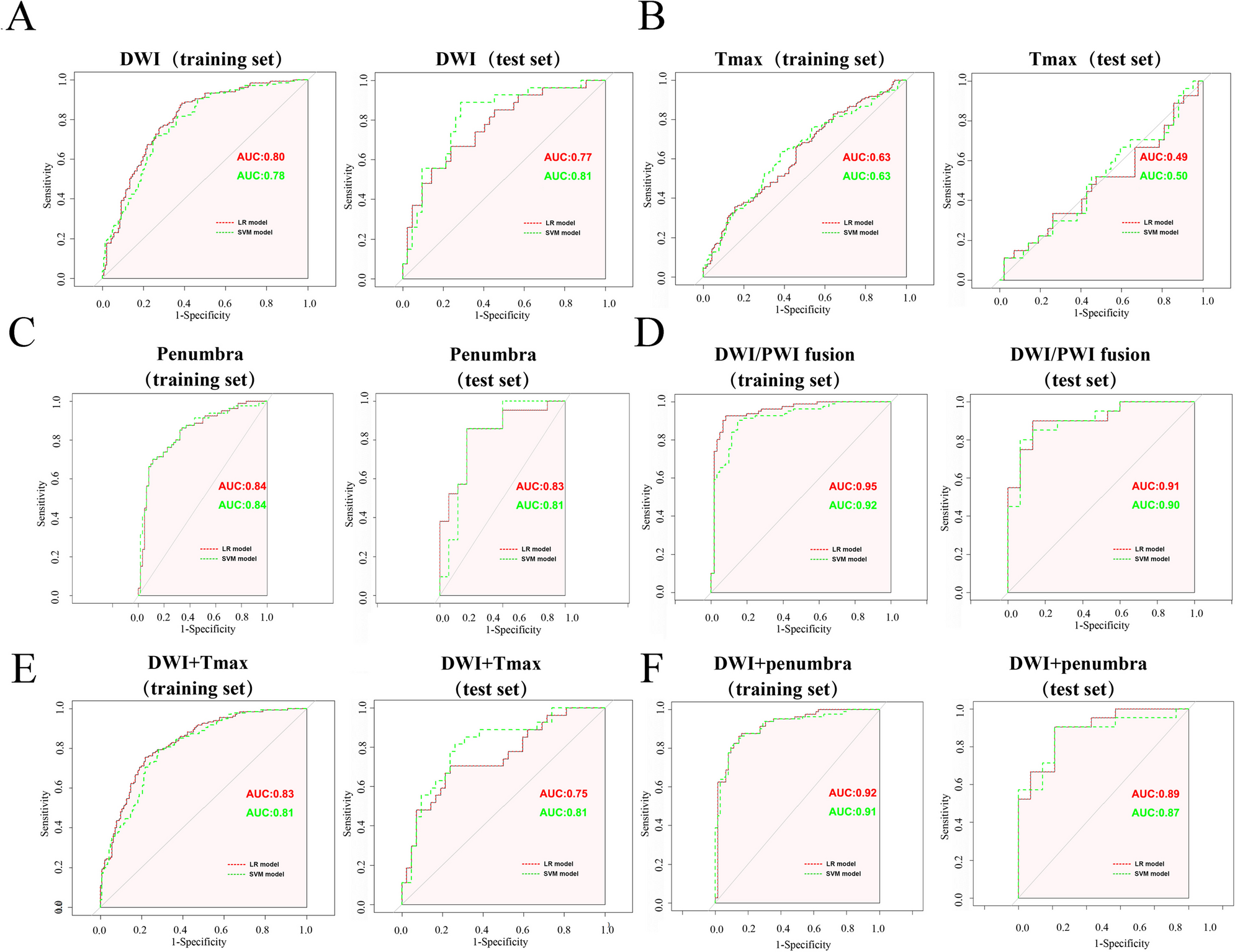 Receiver operating characteristic curves for identifying onset time in acute stroke patients based on DWI (A), Tmax (B), penumbra (C), DWI/PWI fusion (D), DWI+Tmax (E) and DWI+penumbra (F). The AUCs of models containing penumbra features were considerably better than those of the other models, and the DWI/PWI fusion model showed the highest AUC in identifying onset time in the training set (LR: 0.95; SVM: 0.92) and test set (LR: 0.91; SVM: 0.90). AUC area under the receiver operating characteristic curve, LR logistic regression, SVM support vector machine