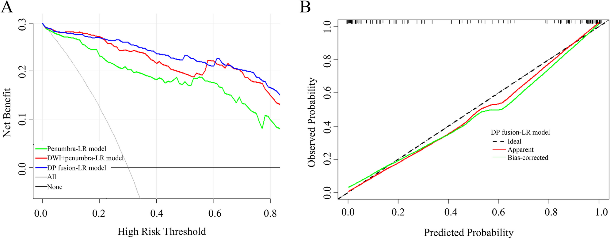 ML models were developed from multimodal MRI datasets of acute stroke patients within 24 h of clear symptom onset from two centers. The processes included manual segmentation, registration, DP fusion, feature extraction, and model establishment (logistic regression (LR) and support vector machine (SVM)). A segmentation-classification model (X-Net) was proposed for automatically identifying stroke within 4.5 h. The area under the receiver operating characteristic curve (AUC), sensitivity, Dice coefficients, decision curve analysis, and calibration curves were used to evaluate model performance.