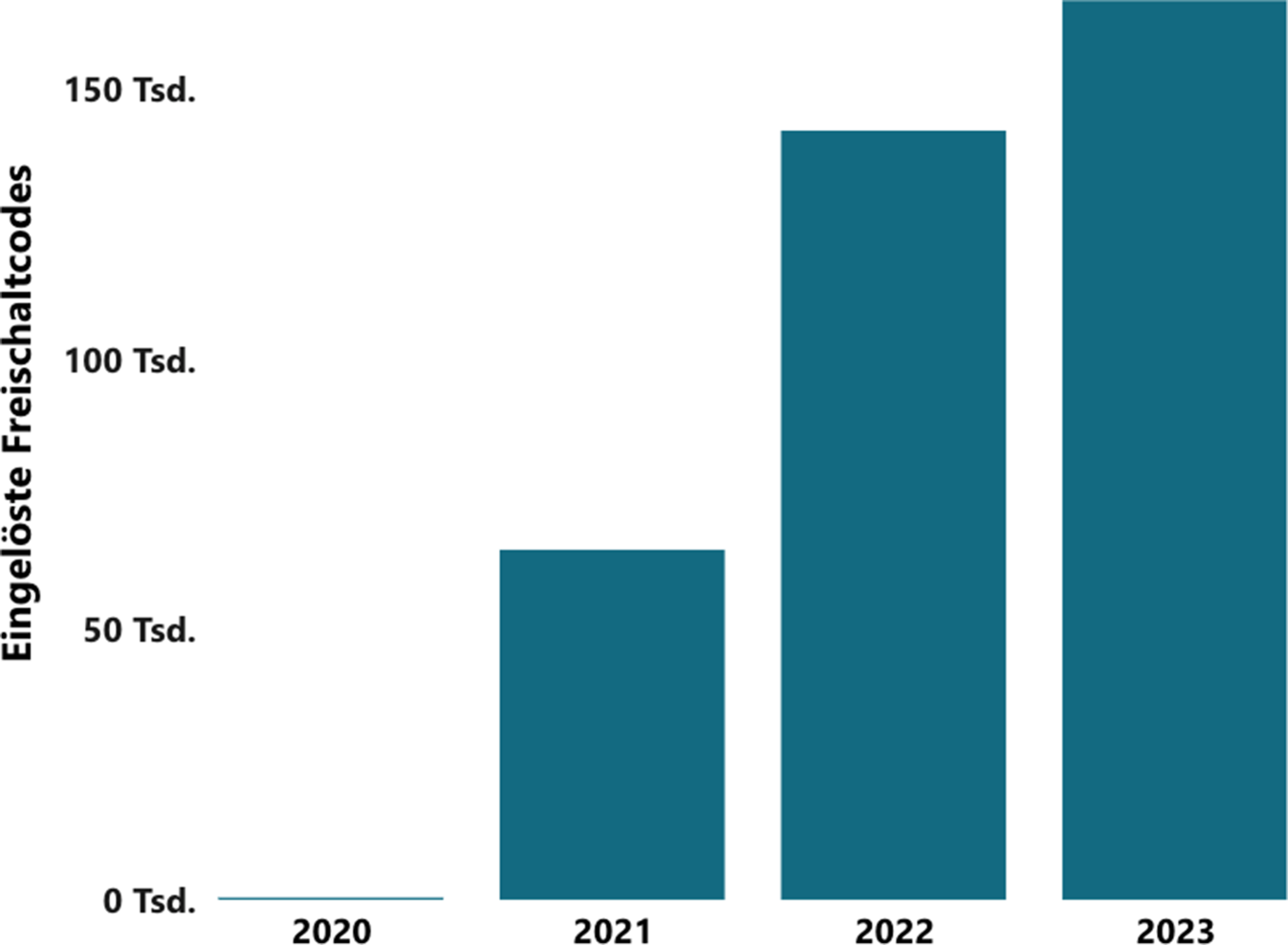 Eingelöste DiGA-Freischaltcodes zwischen 2020 und 2023 laut GKV-Spitzenverband (DiGA: Digitale Gesundheitsanwendungen, GKV: Gesetzliche Krankenversicherung; [3])