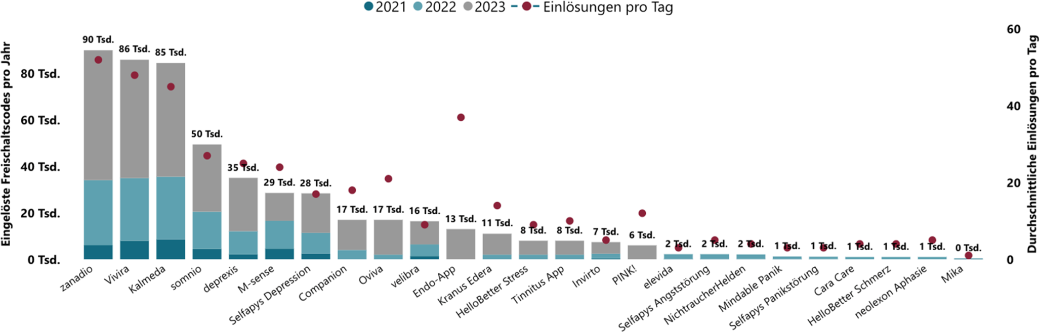 Kumulierte eingelöste DiGA-Freischaltcodes pro Jahr (2021–2023) und Einlösungen pro Tag nach Jahresberichten des GKV-Spitzenverbands [3]