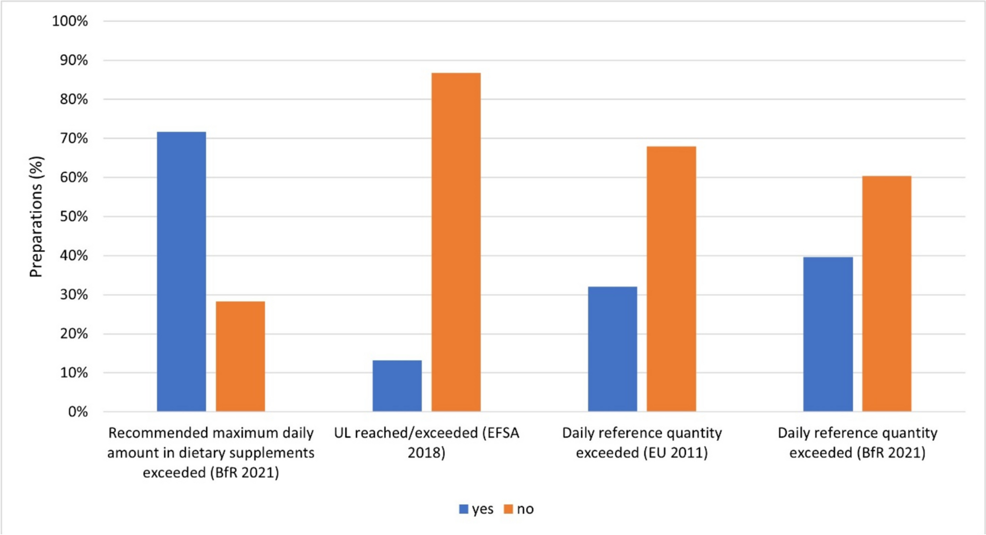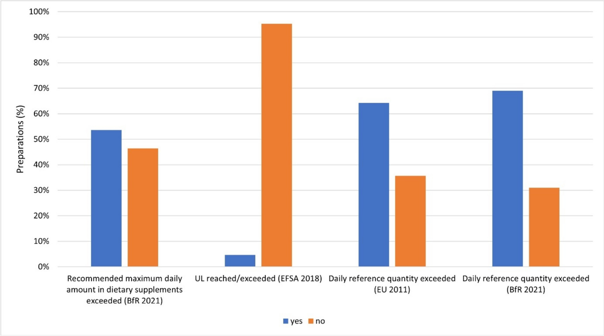 A total of seven dietary supplements (7%) exceeded the Upper Intake Level (UL), and a further four supplements (4%) reached this critical value. Chronic intake of high-dose dietary supplements can entail considerable health risks. For this reason, dietary supplements should only be taken after careful consideration of the costs and benefits, for example in the case of a diagnosed vitamin or mineral deficiency that cannot be remedied by a change in diet.
