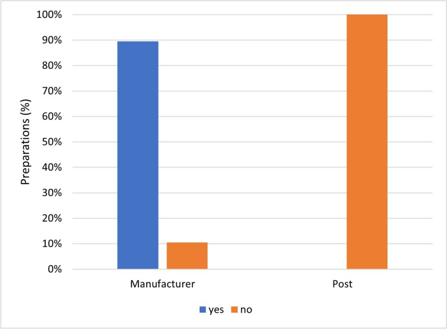 Representation of the frequency of user-friendliness of the dosage information of the preparations by the manufacturer and in the posts as a bar chart, whereby the proportion of preparations with user-friendly dosage information is colored blue, and the proportion of preparations without is colored orange