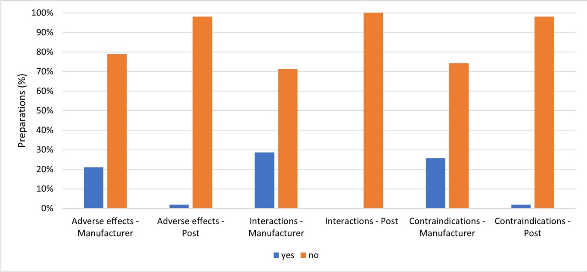 Representation of the frequency of information on adverse effects, drug interactions, and contraindications from the manufacturer and in the posts as a bar chart, whereby the proportion of preparations with an adequate information is colored blue and the proportion of preparations without is colored orange