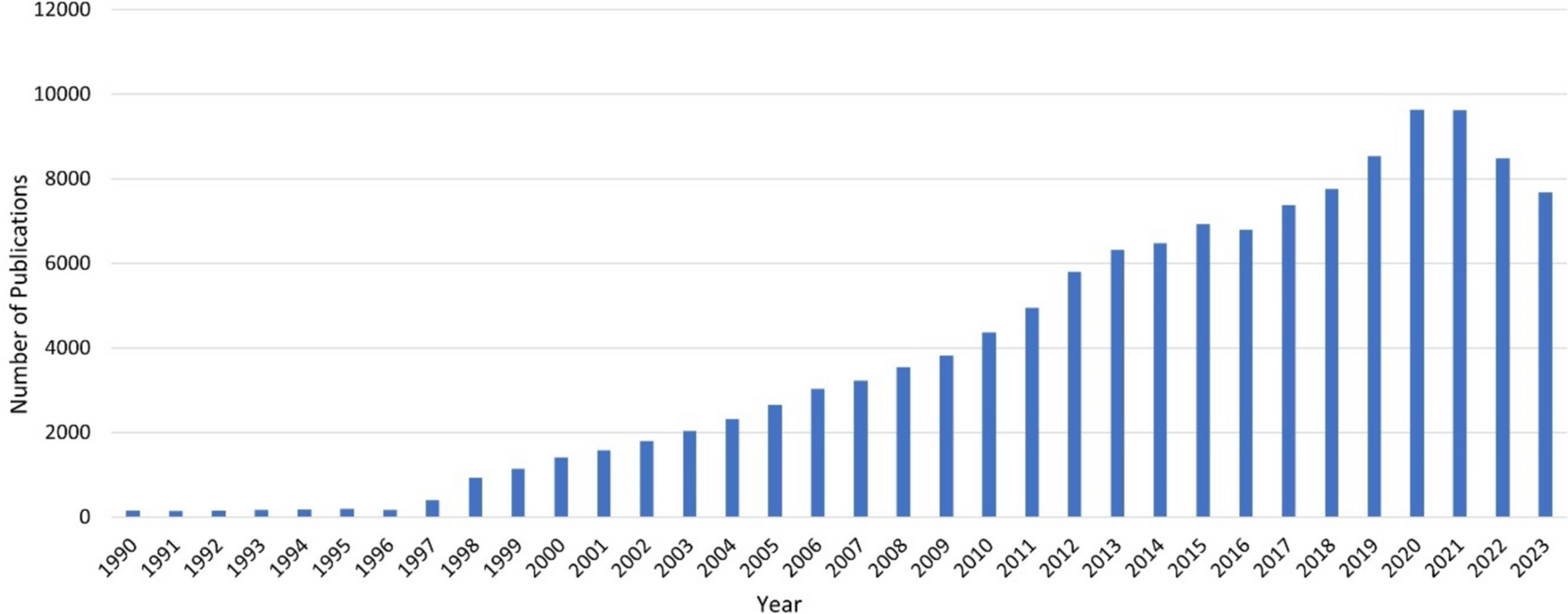 Chronological development of publications for the search terms “dietary supplements” (all fields) on PubMed.gov (retrieved on 30.04.2024)