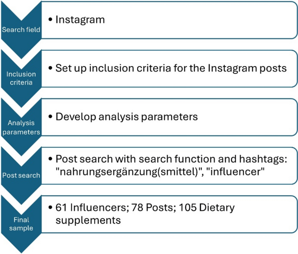 All information about the NEM on Instagram can be found in the influencers’ posts. These posts are accessible to everyone, as only public accounts were analyzed. Further criteria for narrowing down the search for posts were as follows: only German influencers; influencers with more than 10,000 followers; posts from 2021 to 2023; no brand or manufacturer pages and no videos or reels. The posts were found using the hashtags “nahrungsergänzungsmittel,” “nahrungsergänzung,” and “influencer.” The search function on Instagram was used for the search: https://www.instagram.com/.