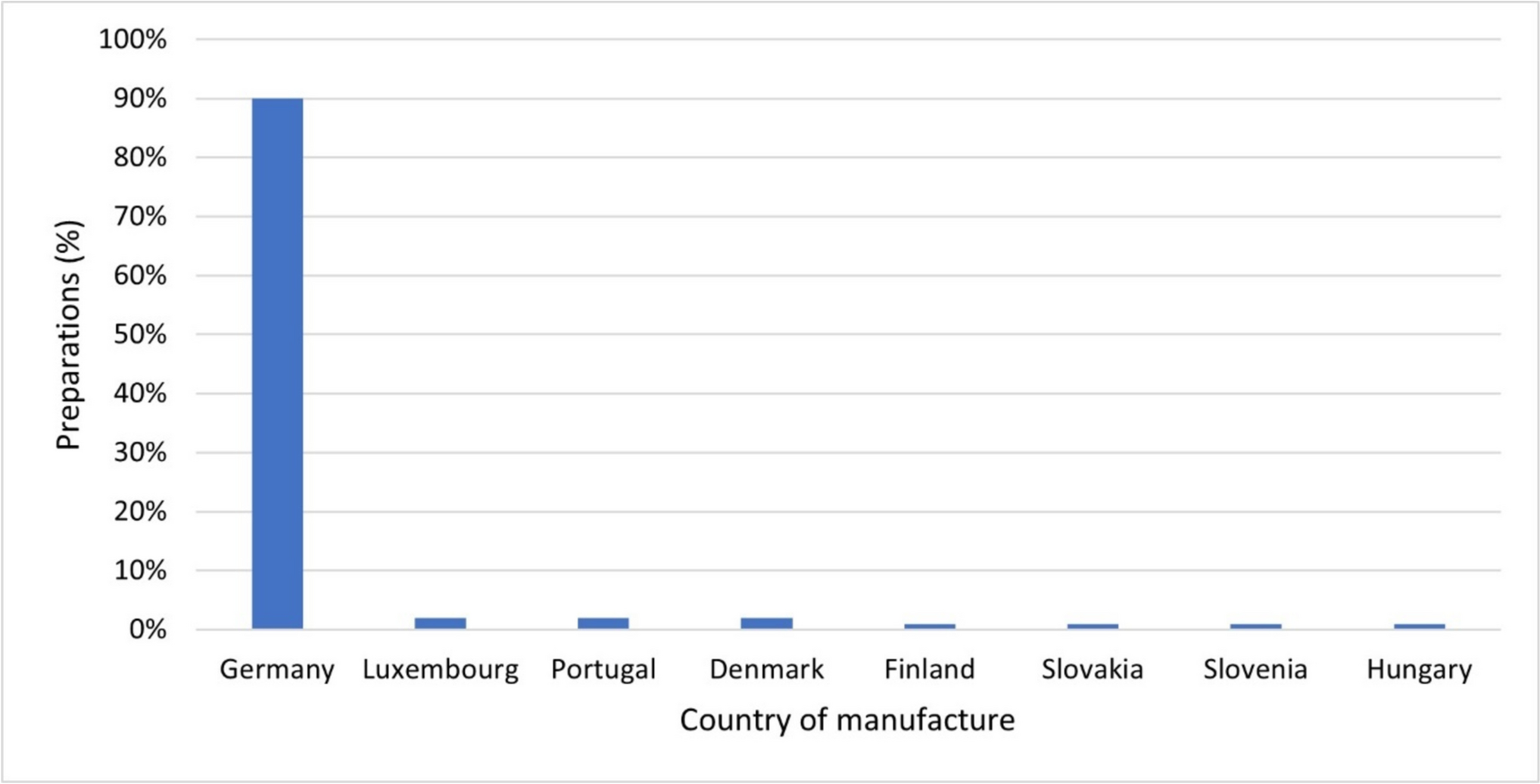 Figure 3 shows the countries of manufacture/country of origin of the preparations analyzed. 90% (95) of the dietary supplements indicated Germany as the country of manufacture/country of origin. The remaining preparations (10 preparations; 10%) were from other EU countries.