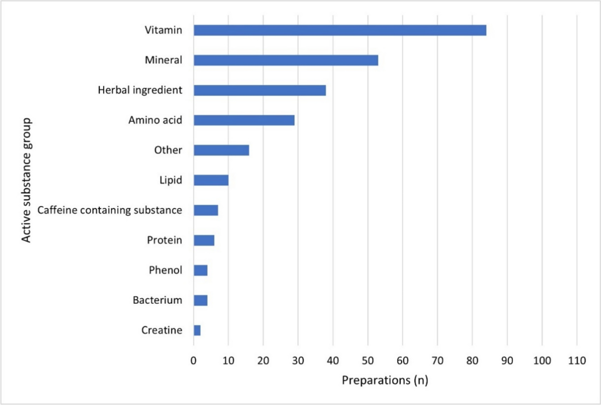 Preparations were declared to be positively suggestive if their product name promised a false or exaggerated positive effect. For example, preparations with the names “Zell Boost,” “Flora Zauber,” or “Ah-Mazing Hair Vitamin” were rated as positively suggestive. Product names such as “Vitamin B12,” “Vitamin C Depot,” or “Zinc+Selenium” were rated as non-suggestive.