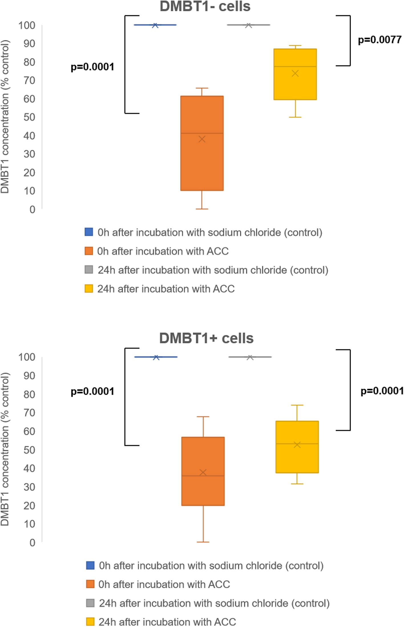 16]. The cells were cultured in DMEM/F-12 (1:1) + GlutaMAX TM medium (Gibco, Thermo Fisher, Karlsruhe, Germany) supplemented with 10% fetal bovine serum (PAN Biotech, Aidenbach, Germany) and 1% penicillin/streptomycin (Sigma-Aldrich Life Science, Taufkirchen, Germany). Hygromycin B (Carl Roth GmbH + Co. KG, Karlsruhe, Germany; final concentration: 500 μg/ml) was added to keep selection pressure on the cells with inserted plasmids. The DMBT1− and DMBT1+ cells were seeded in 6-well plates. After reaching 90–100% confluence, medium was removed and wells were washed with PBS and incubated in medium without fetal bovine serum for 2 h. Then, ACC (Hexal AG, Holzkirchen, Germany; final concentration: 15 mM) or sodium chloride 0.9% as control was added for another 2 h. The medium was collected and frozen at – 80 °C until determination of DMBT1 concentration by ELISA. Subsequently, the cells were washed again with PBS and medium without fetal bovine serum was added onto the cell layer. After 24 h, medium was removed and frozen for DMBT1 determination.