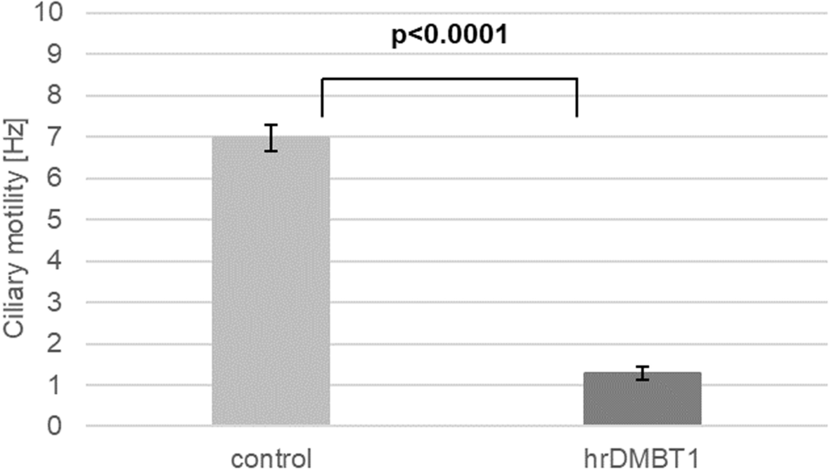 Two nasal swabs with respiratory epithelial cells were collected from each of 10 healthy volunteers (6 males, 4 females) after giving informed consent. The swabs were rotated in a tube with 2 ml of cell culture medium (RPMI 1640, HEPES, Thermo Fisher Scientific, Schwerte, Germany) to separate the respiratory epithelial cells from the swab. Human recombinant DMBT1 (hrDMBT1; final concentration: 0.5 μg/ml) was added to one sample and PBS as control to the second sample of each volunteer. Phase contrast microscopy was used to investigate the motility of the cilia.
