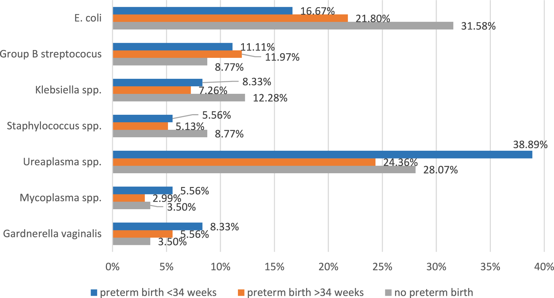 In women with preterm birth before 34 weeks, Ureaplasma spp. was the by far most found species, and E. coli was the most found species in women undergoing preterm birth after 34 weeks but not for those with early preterm birth.