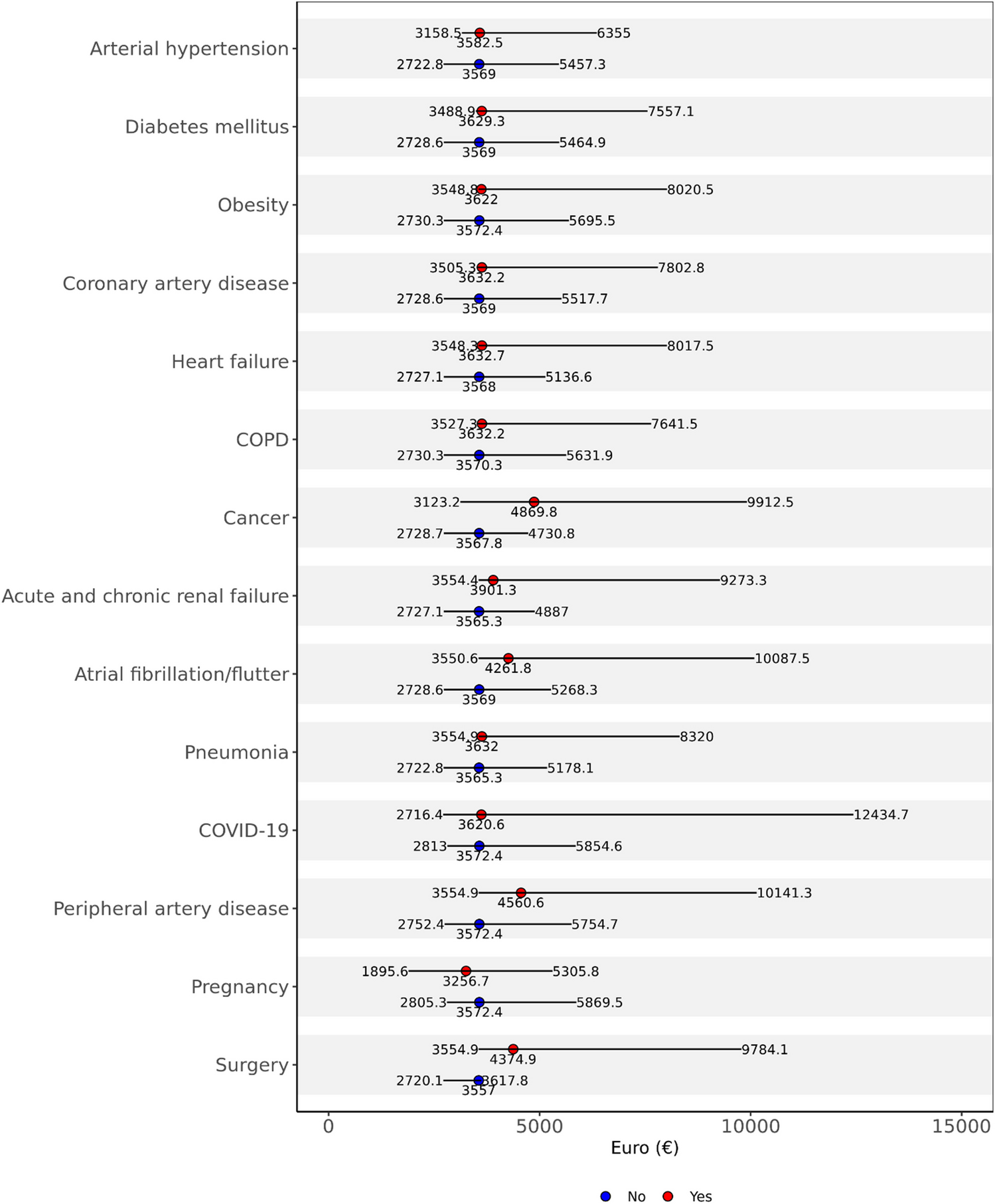 14]. By comparison, in the present study, we analysed actual documented and reimbursed hospitalisation costs in the entire population of a single country. Our results in a population of almost half a million patients in Germany revealed median hospitalisation costs of 3572 euros during the study period, lying at the upper end of the most recent European estimate mentioned above [