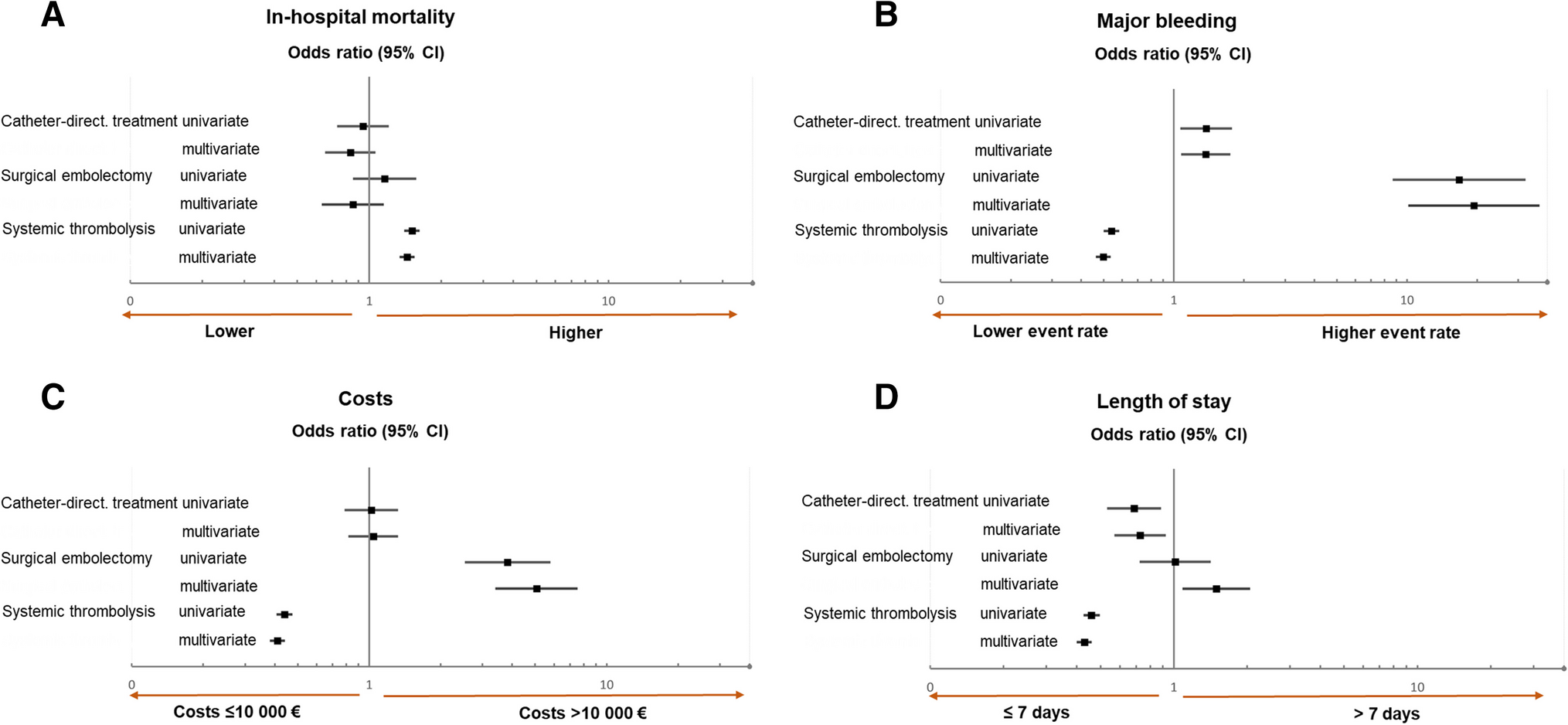 The results are presented as odds ratios (OR) with the corresponding 95% CI; P values < 0.05 (two-sided) were considered to be statistically significant. Associations, in specific patient subgroups (such as those with severe PE or shock), of different reperfusion treatment procedures with in-hospital mortality, major bleeding, hospitalisation costs and length of stay, are presented as forest plots showing the results of univariate and multivariable (model II) regression analysis. All statistical analyses were performed with the SPSS software (IBM Corp. Released 2011. IBM SPSS Statistics for Windows, version 20.0. IBM Corp: Armonk, NY, USA).