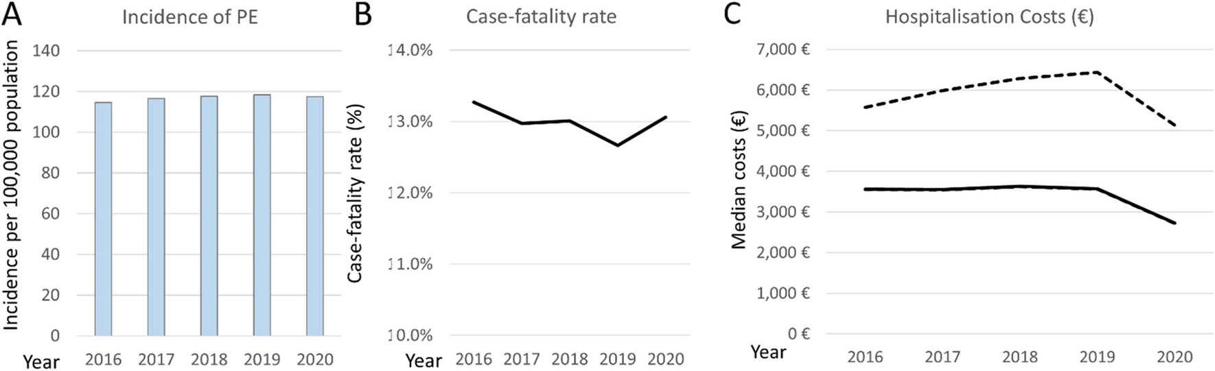 Aiming to contribute to the closure of this gap and to begin to inform decision-making, we analysed, in the present study, the entire German nationwide inpatient population hospitalised for acute PE from 2016 to 2020. We aimed to obtain actual reimbursed hospitalisation costs, comparing them to those of the other two most frequent acute cardiovascular syndromes, myocardial infarction and (ischaemic) stroke. We further aimed to identify patient characteristics, procedures and complications independently affecting the cost of hospital stay and calculate annual trends of hospital reimbursements. In this regard, we placed a focus on patients in the upper categories of clinical PE severity and early risk of death.