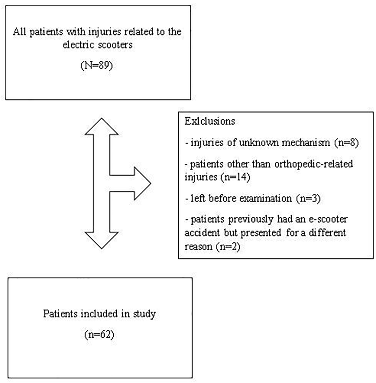 A retrospective analysis was made of all patients who presented at Diyarbakır Gazi Yaşargil Training and Research Hospital (level 3 trauma centre) and Diyarbakır Selahaddin Eyyubi State Hospital (level 2 trauma centre) emergency service with orthopedic injury after an e-scooter accident between January and July 2022 and were operated on in the Orthopedics and Traumatology Department. Patient data were obtained from the hospital database. Approval for the study was granted by the Institutional Review Board. The study was conducted in accordance with the principles of the Helsinki Declaration. All patients who presented at the Emergency Department, either as a rider or pedestrian, with an e-scooter-related orthopedic injury were included in the study. Patients who were excluded from the study if the mechanism of injury was not clear or if they had previously had an e-scooter accident but presented for a different reason. Patients left before examination or patients other than orthopaedic related injuries also excluded from the study. See flow chart in Fig. 1.
