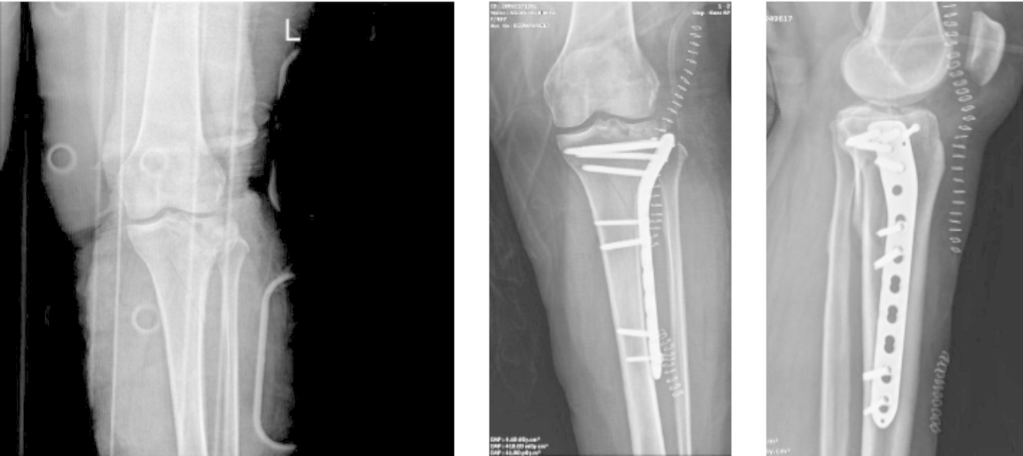 A 45-year-old male patient with tibial plateau fracture after falling from e-sccoter. (A) Preoperative antero-posterior radiography, (B) Postoperative antero-posterior radiography, (C) Postoperative lateral radiography