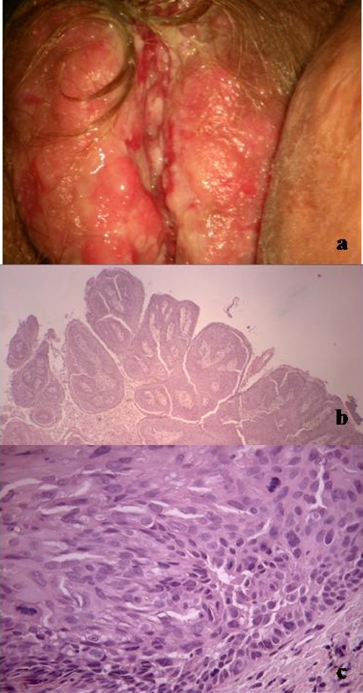 Macroscopic and microscopy findings at diagnosis: (a): vulvar bleeding vegetants lesions; (b): micropapillary pattern; (c): acantholysis and mitosis.