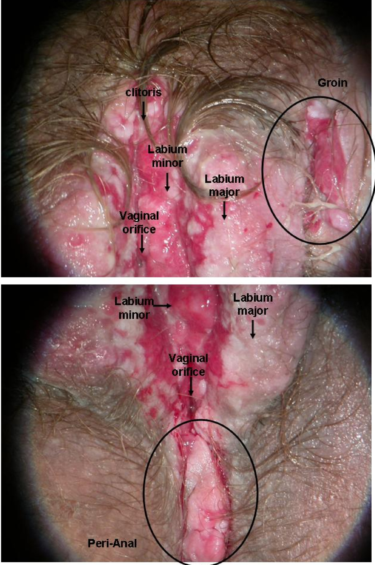 A 27-year-old Caucasian woman was admitted to our Gynaecology Unit (February 2007) for bleeding vegetant lesions of the vulva. She had no family history of autoimmune disease. Her history was characterized by concomitant SLE and recurrent blisters and erosions affecting the oral mucosa and skin diagnosed as severe PV. She had been treated with high and prolonged doses of both systemic corticosteroids and other immunosuppressive drugs (Prednisone 100 mg/day × 69 months; Azathioprine 80 mg/day × 51 months; Cyclophosphamide 83 mg/day × 15 months; Cyclosporine 300 mg/day × 2 months).