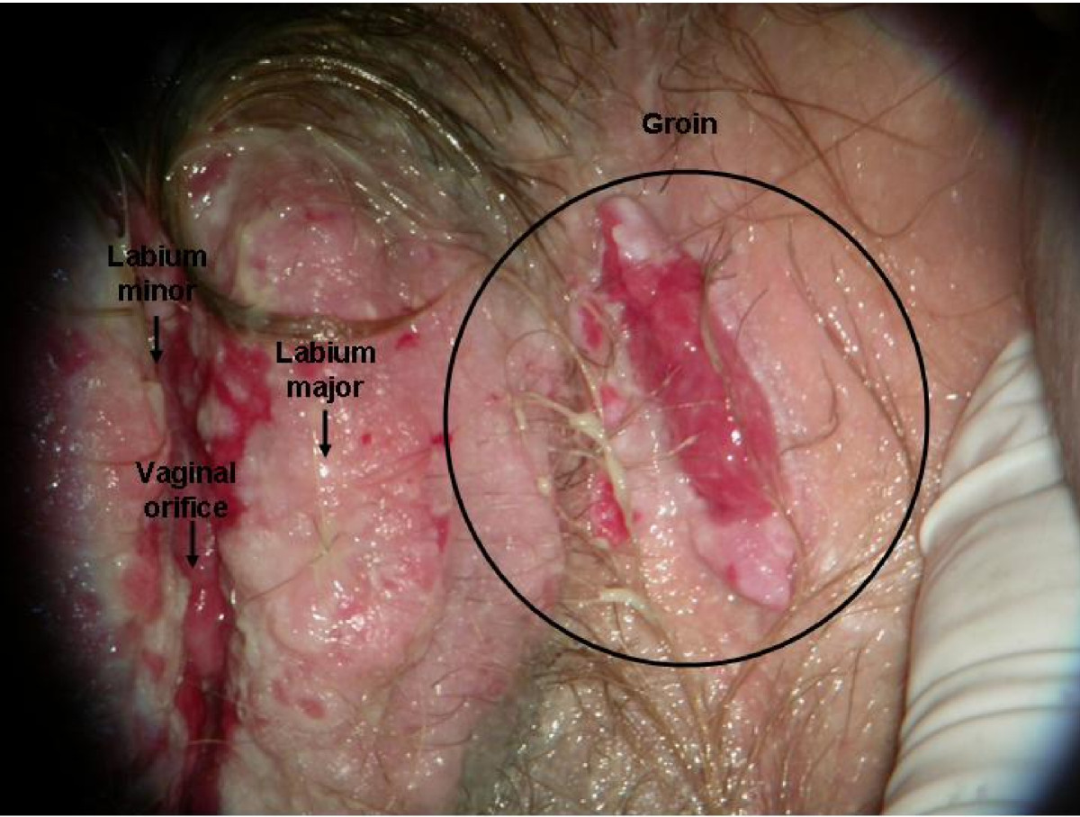 Pemphigus vulgaris (PV) is an autoimmune blistering disease of the skin and mucous membranes characterized by the presence of autoantibodies targeting desmoglein 3, a surface antigen of keratinocytes involved in maintaining cell-cell junctions [1]. Its incidence is 0.1-3.2 cases per 100,000 individuals per year. PV typically runs a chronic course, with blisters, painful erosions and ulcers on the mucosa and skin [2, 3]. The sites most commonly involved are the oral mucosa, pharynx, larynx, oesophagus, conjunctiva and anal mucosa [1‐4]. Involvement of the genital tract in women with PV has rarely been reported [5]. Usually, genital involvement occurs when most other common sites are concurrently affected or are in remission [1, 6].