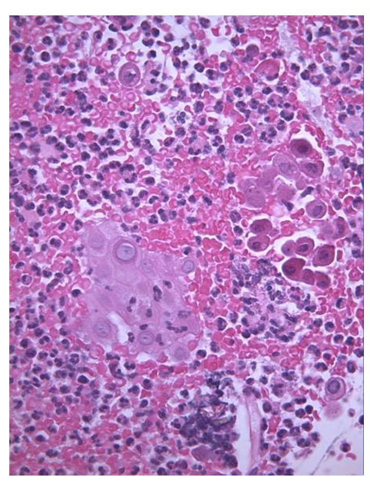 Despite the chemotherapy there was no remission of the lesion, though no local extension was observed (Figure 4). A new biopsy (September 2007) revealed atypical and acantholytic cells dispersed into a neutrophil and red blood cell background (Figure 5). Two months later she died from cardiac arrest due to worsening of her general condition. but no post mortem examination was performed because her parents refused.