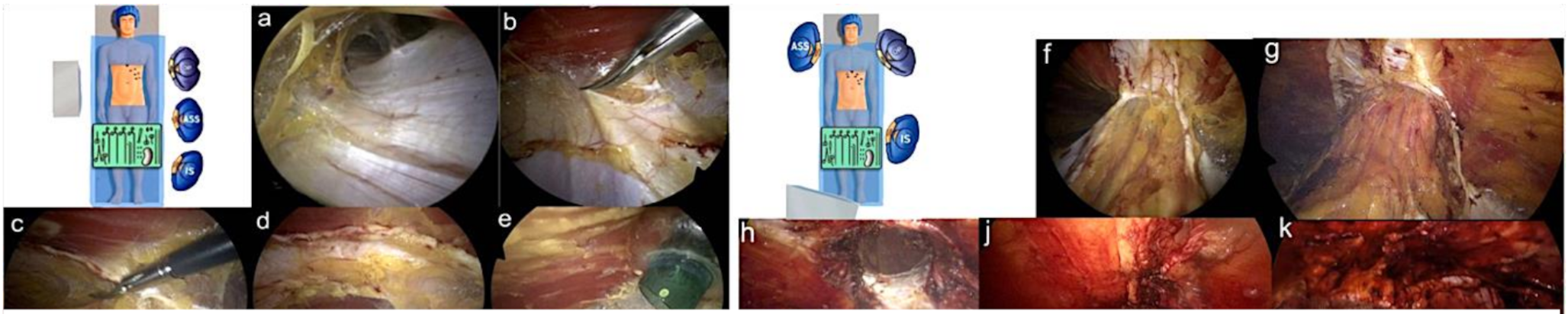 Laparoscopic eTEP (a) Blunt dissection of the retro muscular space; (b) Transection of the posterior fascial layer; (c) Preperitoneal dissection behind the linea alba; (d) Transection of the contralateral posterior fascial layer and opening of the retro rectal space; (e) Placement of the camera trocar in the contralateral retro muscular space; (f) Cranio caudal view of both retro-muscular and preperitoneal space; (g) Cranial depiction of the hernia; (h) Repositioning of the hernia sac and content; (j) Continuous closure of the defect; (k) Placement of the mesh