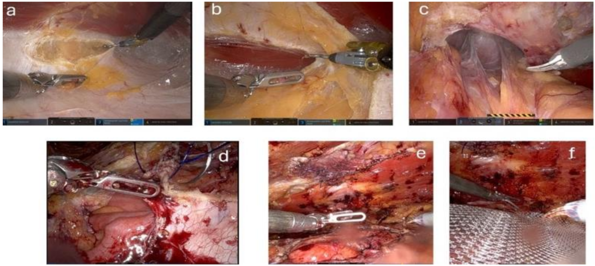 Robotic eTEP (a) Transection of the posterior fascial layer on the left side; (b) Preperitoneal dissection behind the linea alba and transection of the contralateral posterior fascial layer, opening of the right sided retro muscular space; (c) Repositioning of the hernia sac; (d) Closure of the hernia defect; (e) closed defect; (f) Placement of the mesh