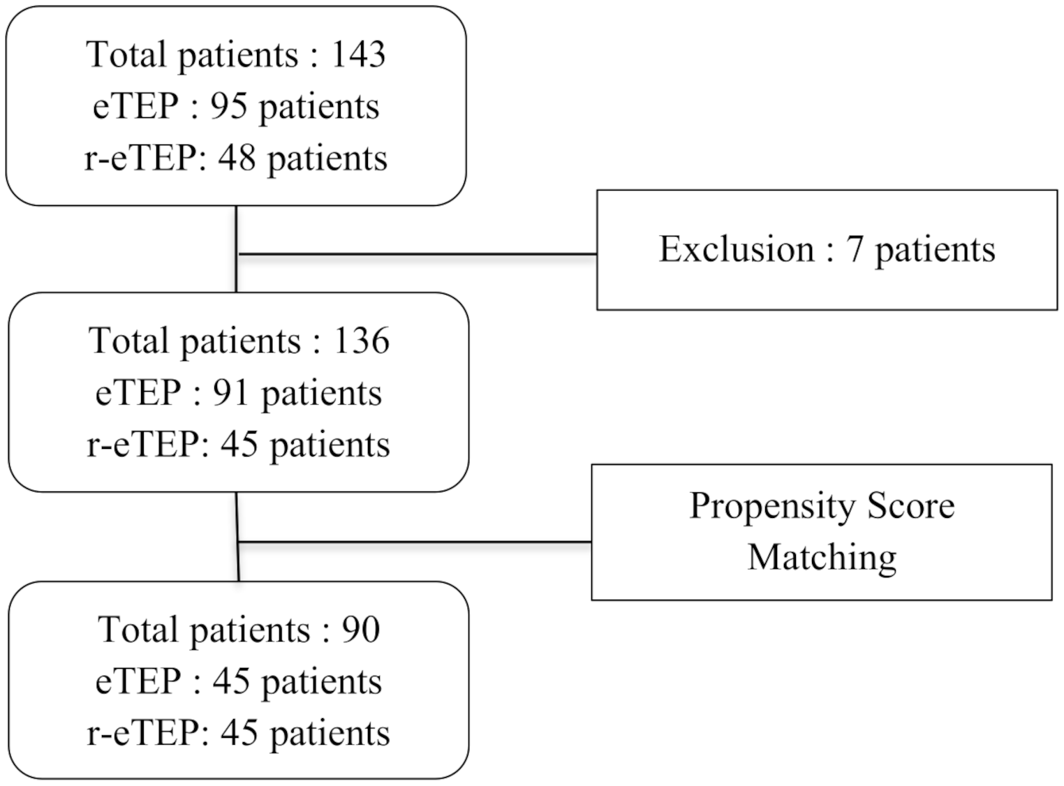 This flowchart illustrates the total number of patients and their distribution between the eTEP and r-eTEP groups. It shows the initial patient count, the number of patients after exclusions, and the final numbers after Propensity Score Matching (PSM)