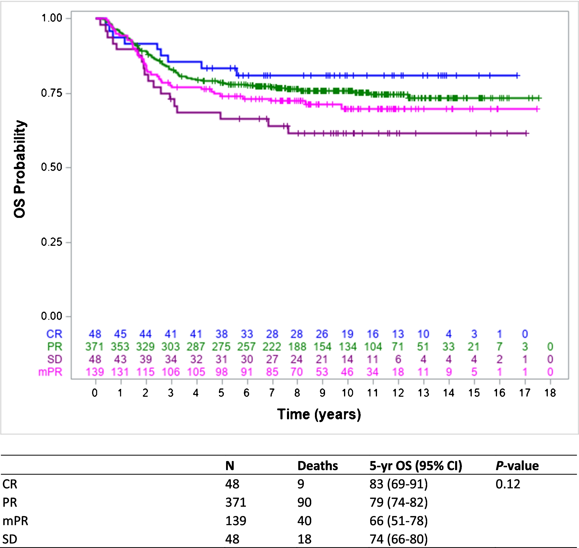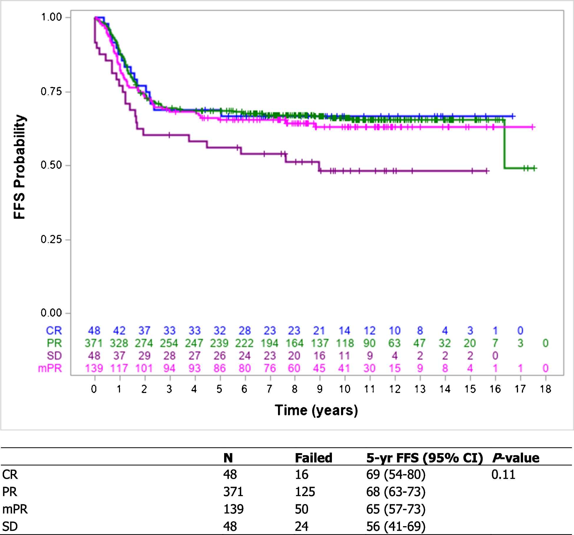 Failure-free survival and overall survival were defined as outcomes. Failure-free survival is the time from response assessment (landmark point) to disease progression, local and/or metastatic relapse, a second malignancy, or death from any cause. Overall survival is the time from response assessment to death from any cause.