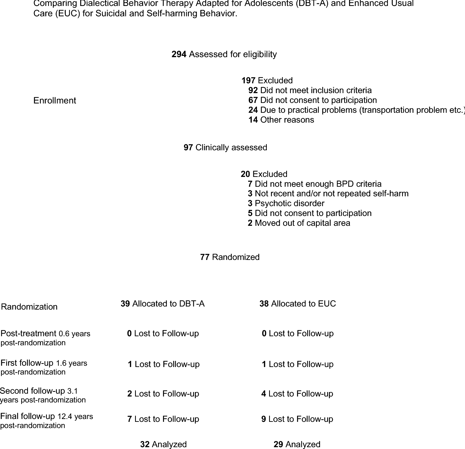 This study benefitted from a unique sample of treatment-seeking adolescents in a real-world, multicentre health care setting, followed for over 12 years into adulthood with both clinical and self-reported data. Moreover, it was a prospective long-term follow-up design of an RCT and, despite the very long follow-up interval, we had a high retention rate (80%). However, there are also several limitations to the study. First, the sample size is small, which might possibly have been too small to detect more nuanced differences, and results should thus be interpreted with caution due to the lack of an a priori power calculation. Second, the length of the final follow-up period of over 9 years substantially increases risk of unmeasured confounding, for example related to type of treatment received during this time. Third, the sample was demographically homogenous, and the findings are not generalizable to boys or minority youth. Moreover, the main outcome in this study was only measured at one timepoint and not at baseline, which impeded longitudinal analyses of treatment*time effects, and also the possibility to investigate changes occuring during the course of treatment. Future studies should aim to explore potential long-term mechanisms of therapeutic change in crossover or parallel designs, where potential mediators could be manipulated experimentally. Furthermore, replication studies or adult follow-up assessments of other DSH treatments for adolescents, such as emotion regulation individual therapy for adolescents [