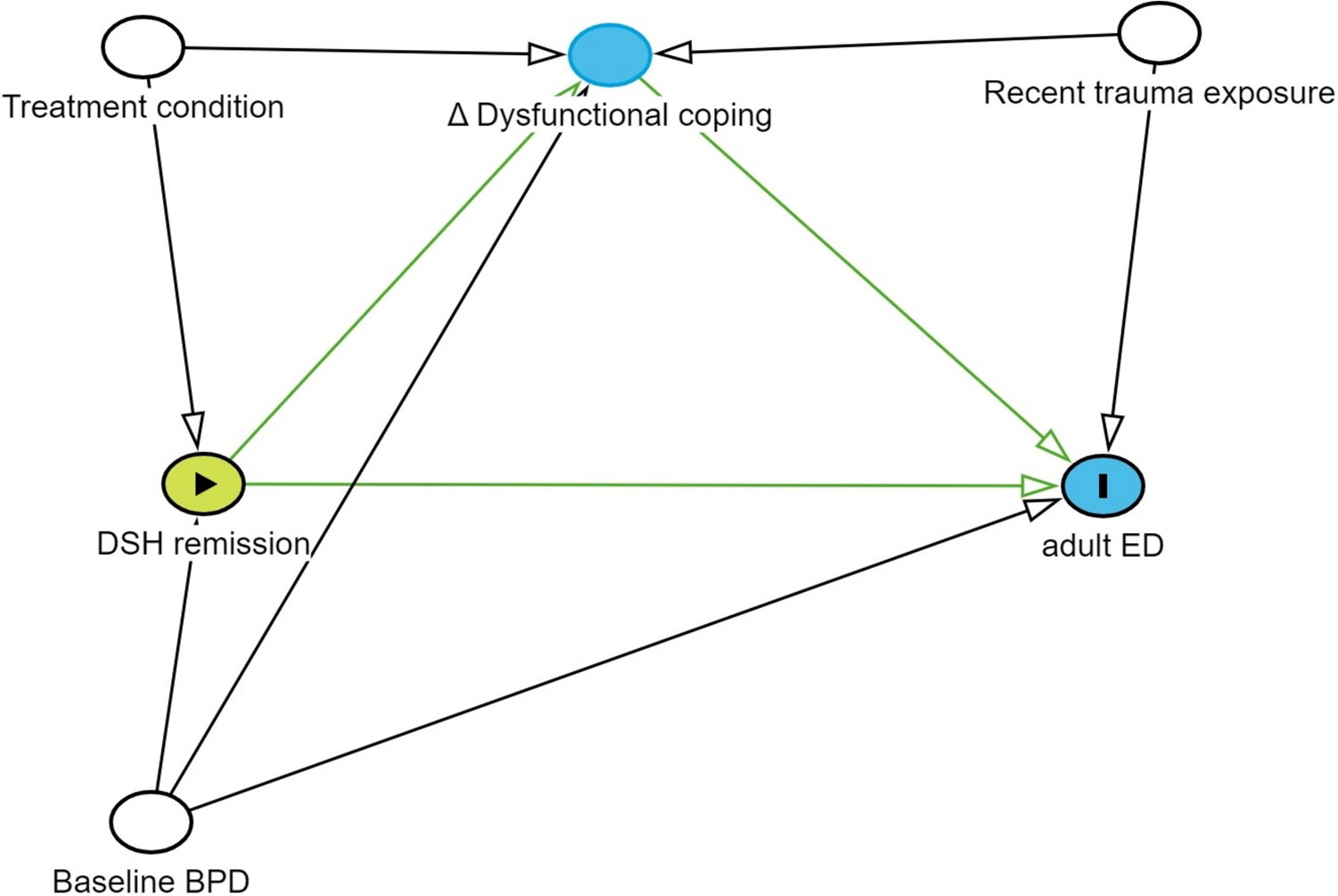 This study aimed to investigate whether adult ED was influenced by early established behavioral patterns, such as persistent DSH and use of dysfunctional coping. We hypothesized that in a developmental perspective, successful treatment in adolescence might enhance emotion regulation capacity in adulthood if behavioural change is achieved. In that endeavour, we investigated whether DSH remission in adolescence had a direct effect on adult ED, and if this effect was mediated through subsequent reductions in dysfunctional coping.